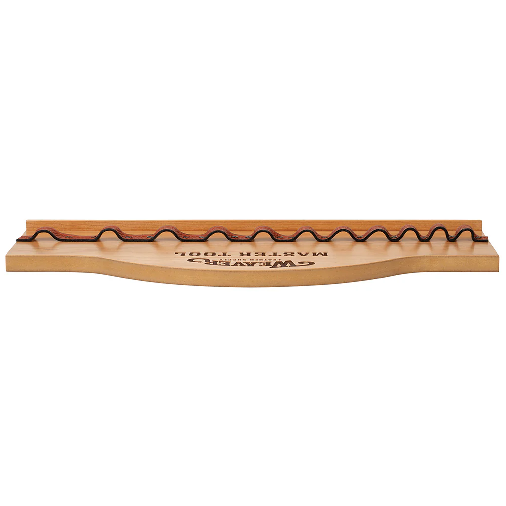 - Basketweave stamped leather strap and wood ledge keep punches in place