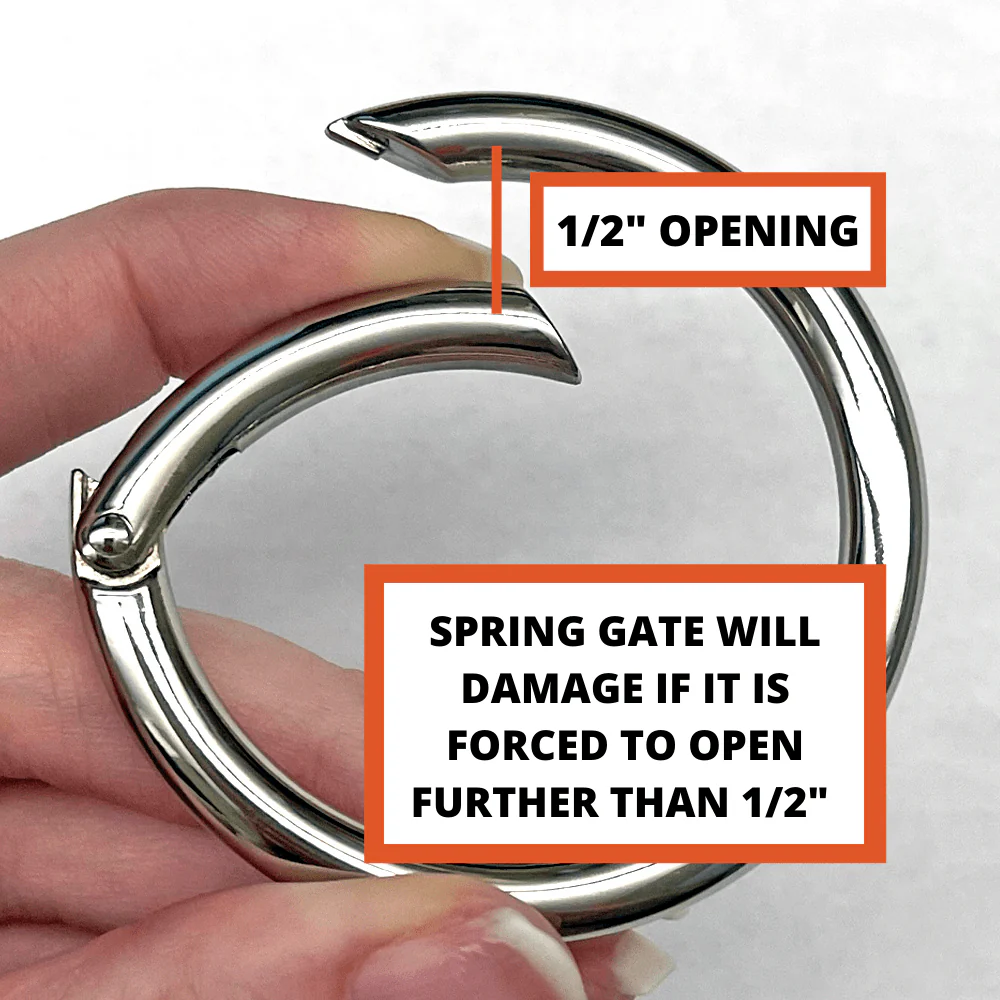 - NOTE: Spring gate will damage if it is forced to open further than 1/2"